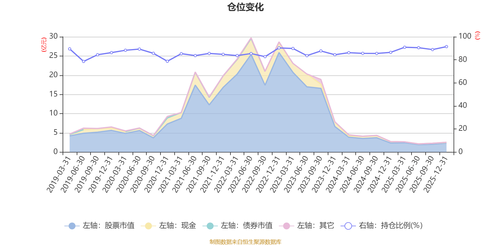 据定期报告数据统计,近三年平均股票仓位为87.59%,同类平均为88.27%。2025年末基金达到91.43%的最高仓位,2019年上半年末最低,为78.6%。